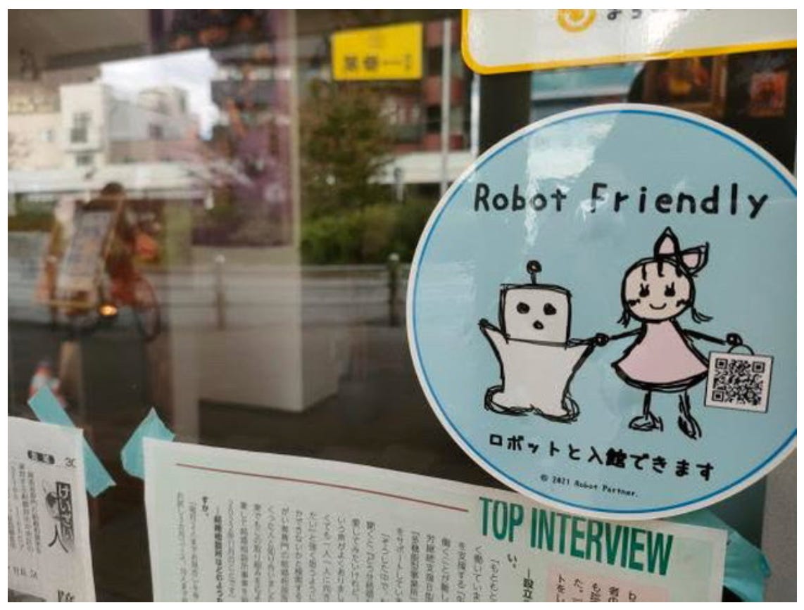 A blue sticker is appearing on storefronts across Japan. It shows a simple drawing: a small robot and a girl with a shopping bag, standing side by side. Underneath, in Japanese: ロボットと入店できます: “You can enter with your robot.”